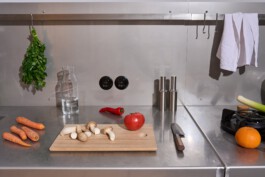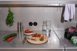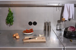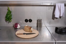 Das ist unsere Auffassung — und wir unterstützen Dich mit einem Repertoire an gut gelösten Details. Eichenholz ist von Natur aus antibakteriell und gerade deswegen die richtige Wahl für eine Schneideunterlage. Bedeutet konkrett: Eichenholz desinfiziert sich selbst nach jeder Einkerbung der Oberfläche. Verschiedene Größen, Formen und Proportionen überlassen dir die Entscheidungsfreiheit welches Brett du für welche Nutzung verwenden möchtest. Hierbei war eine Geruchstrennung unser Anreiz — Niemand mag Apfel mit Zwiebelgeschmack. Innere Metallverstrebungen verhindern zudem das Verwerfen des Holzes gegen äußere Einflüsse. Hinzu kommt eine wasserfeste Verleimung. Beide Punkte versprechen eine langlebige Nutzung und Dauerhaftigkeit. Eine Grifföffnung sowie umlaufende Radien erleichtern die intuitive Handhabe bei der Essenszubereitung erheblich und betonen den Charakter eines einheitlichen Sets.